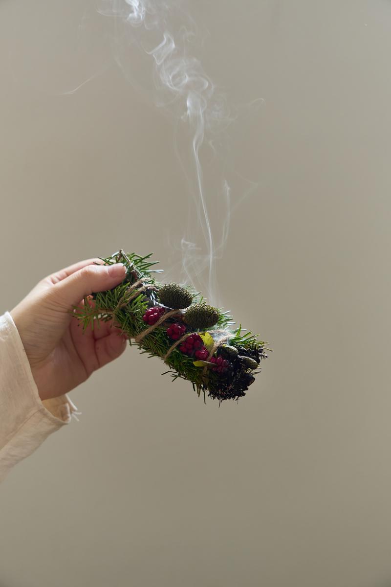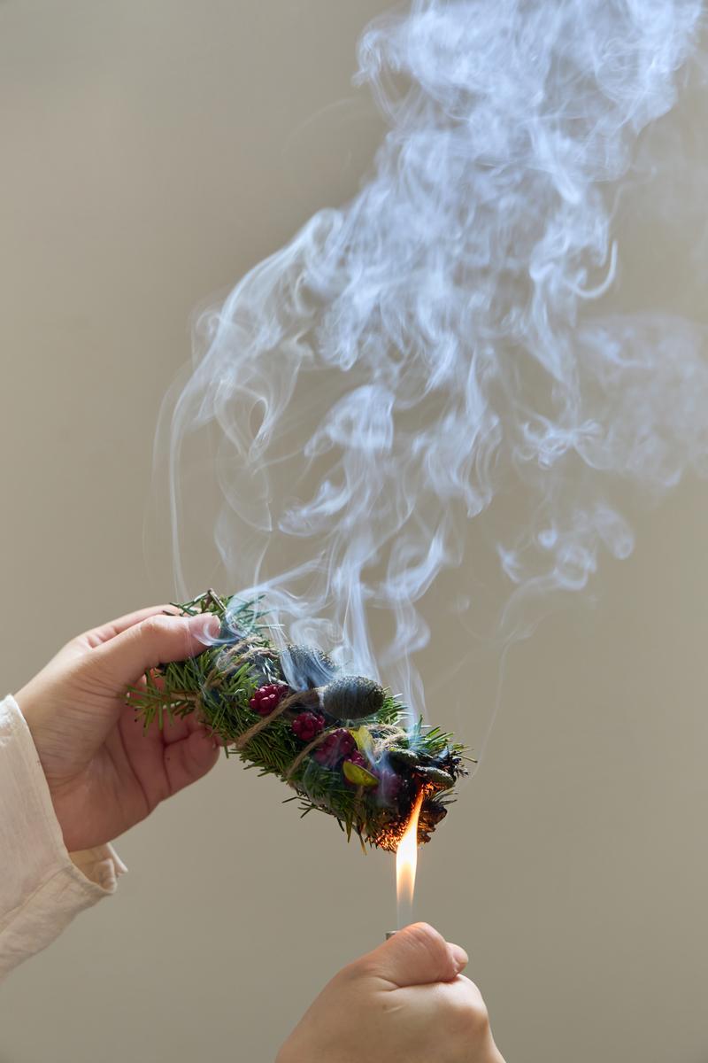 먼저 환기를 위해 창문을 살짝 연 후 스머지 스틱 한쪽 끝에 불을 지핀 후 불이 붙으면 바로 꺼주세요. 피어오르는 연기로 여러 공간에서 한번씩 살살 흔들어 준 후 불연성 소재의 트레이에 올려두고 잔향을 느껴보세요.