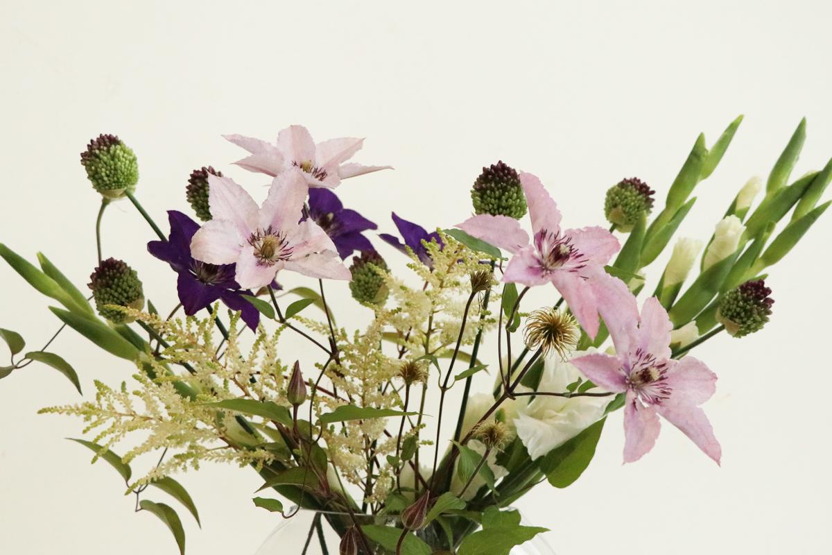 클레마티스, 아스틸베, 글라디올러스를 함께 조합한 모습