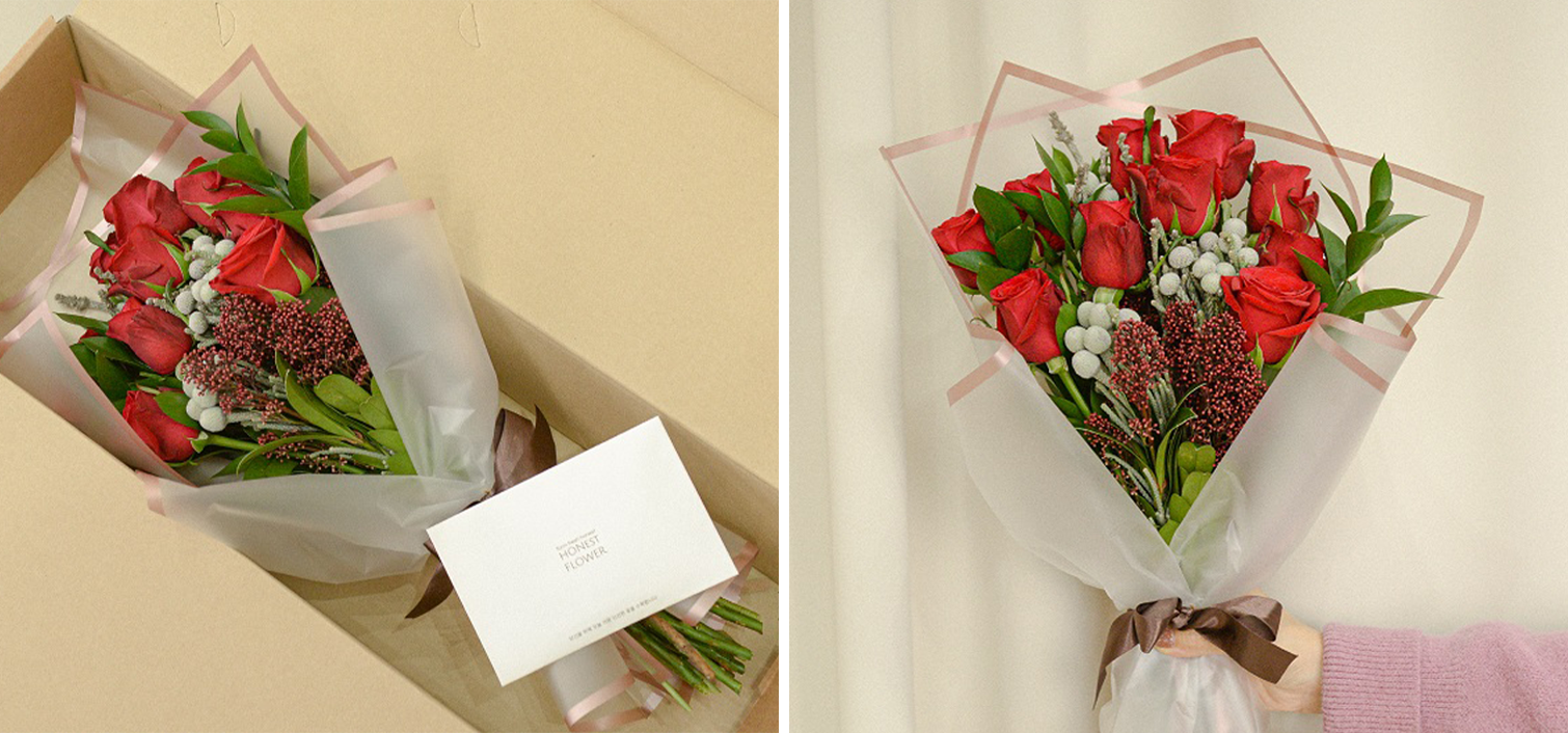 내가 직접 보지 않고 선물이 필요할 때에는 컨디셔닝, 포장 옵션을 추가할 수 있습니다. 전문 플로리스트가 섬세하게 장미와 소재류를 다듬어서 더욱 손쉽게 바로 연출할 수 있도록 안전하게 포장합니다. 보통은 어니스트 로고가 있는 종이 포장재를 사용하지만 특별한 느낌을 연출하고 싶다면 투명 포장재로 조금 더 고급스러운 선물로 연출해보세요. 택배로도 안전하게 배송이 될 수 있도록 선물포장될 예정입니다. 배송 패키지 옵션은 꽃의 크기에 따라 유연하게 사용될 수 있습니다.