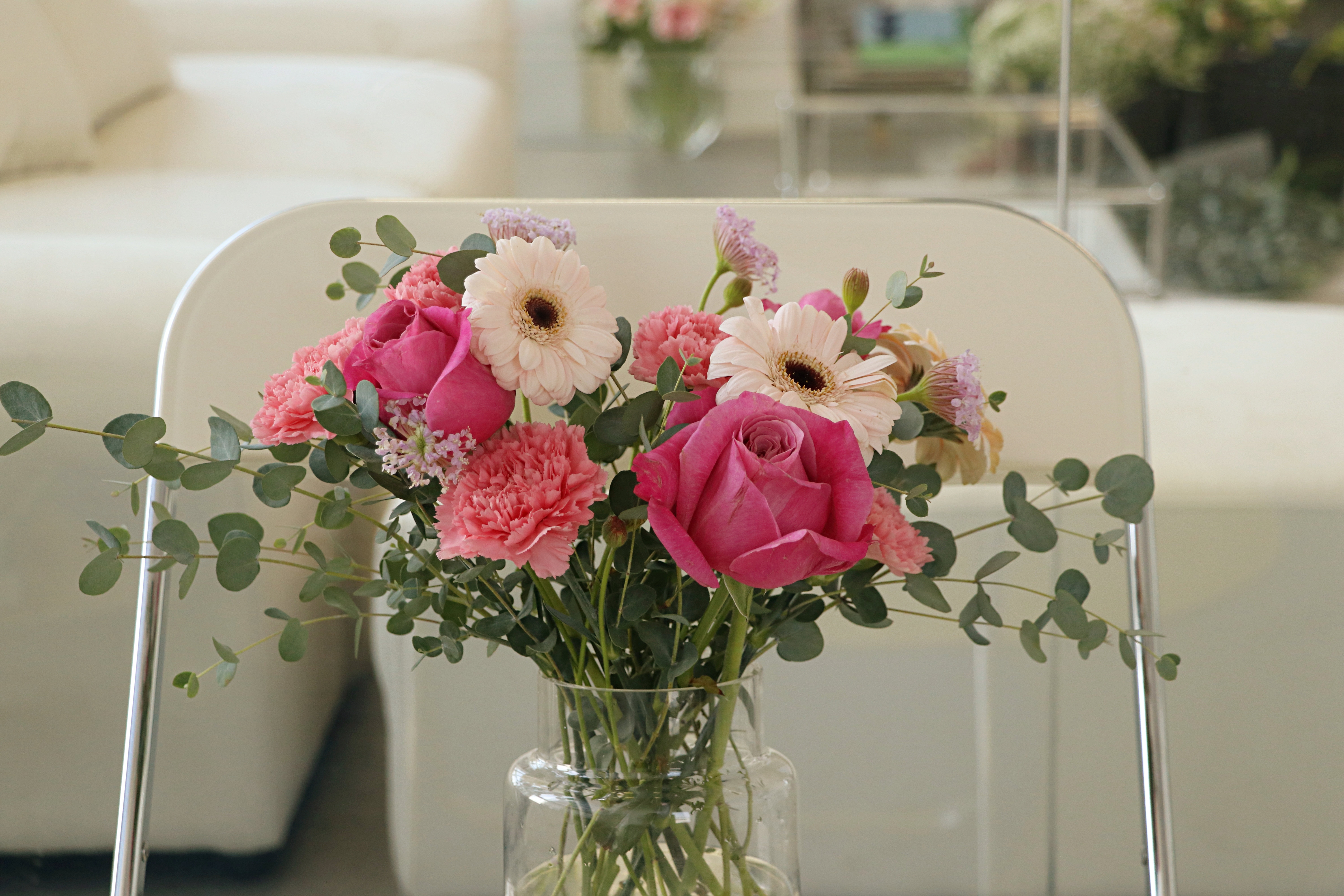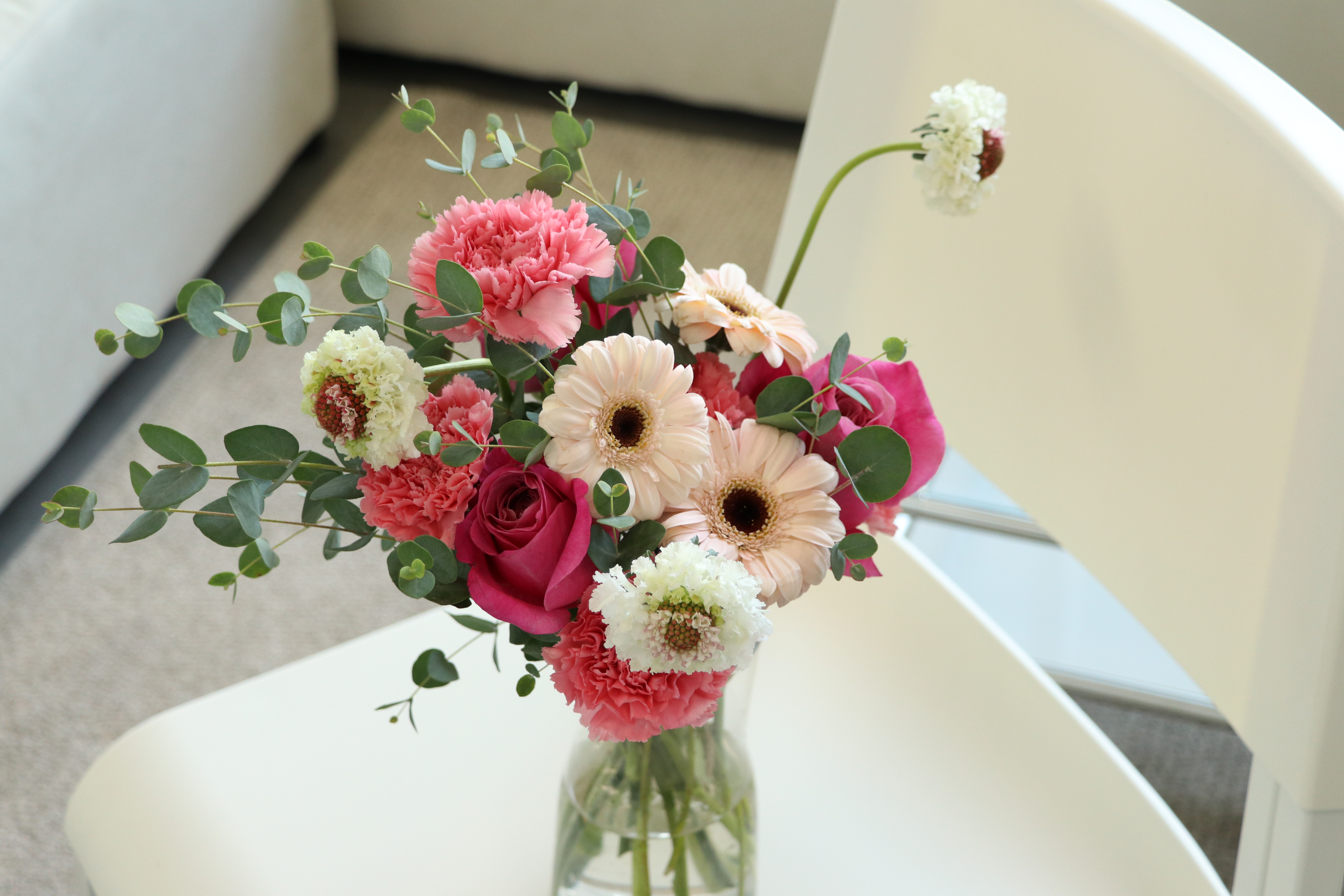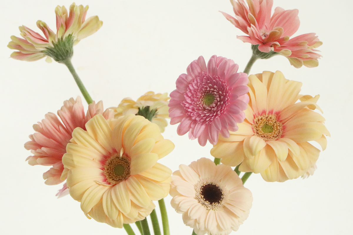 거베라 하면 화환으로만 생각하지만, 기존의 선입견과 달리 '거베라도 이렇게 예쁠 수 있는 꽃' 임을 더 많이 알리고 싶었는데 거베라 만으로도 감각적이면서 약간의 레트로한 분위기도 자아내어 최근에는 인테리어 용으로도 사랑받고 있습니다. 특별한 컨디셔닝 없이도 누구나 쉽게 오랫동안 즐길 수 있기에 초보에게도 추천할 수 있는 무난한 꽃입니다. 거베라는 줄기의 높이를 각기 다르게 차이를 두어 투명한 유리화병에 줄기를 서로 교차하여 나선형으로 돌려가며 꽂으면 손쉽게 연출할 수 있습니다. 거베라 꽃잎 중 일부는 갈라져 있을 수 있으며 이것은 변형된 것이 아닌 자연스러운 현상입니다.