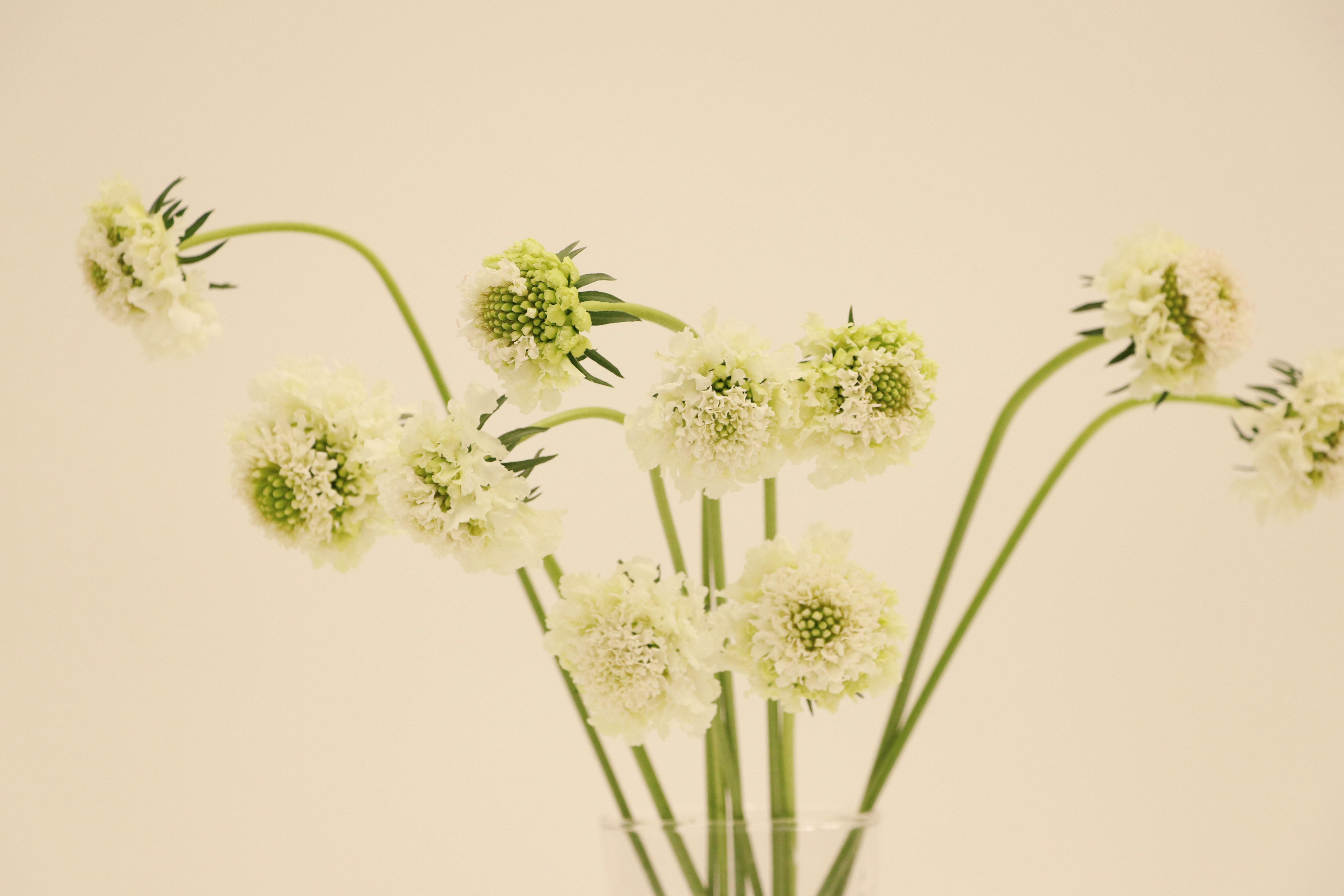 매력적으로 뻗어나가는 줄기의 우아한 꽃을 가진 스카비오사는그 독특한 개성과 아름다움을 인정받아 최근 인기가 높아지고 있는 품종 중에 하나입니다. 방울처럼 동그란 모양으로 차례를 지어 꽃을 피우는 모습 때문에 '방울 스카비오사' 라고도 불리며 귀여운 사탕다발과 같은 느낌을 주기에 단독으로도, 필러로도 인기가 많습니다. 줄기가 꽃에 비해 가늘기 때문에 물올림을 위해서 사선컷팅을 해주는 것이 좋으며 물올림이 되면 줄기가 보다 단단해져서 생각보다 오래 지속됩니다. 꽃의 무게로 인해 자연스럽게 줄기가 라인을 만들어 내는것이 무척 우아한 꽃입니다. 물에 꽂힌 상태에서 잎사귀 부분이 조금씩 커지면서 꽃의 형태가 바뀌는 모습을 지켜보는 즐거움이 있는 꽃입니다. (사진은 참고사진이며, 실제 발송은 화이트 톤의 꽃으로 발송됩니다.)