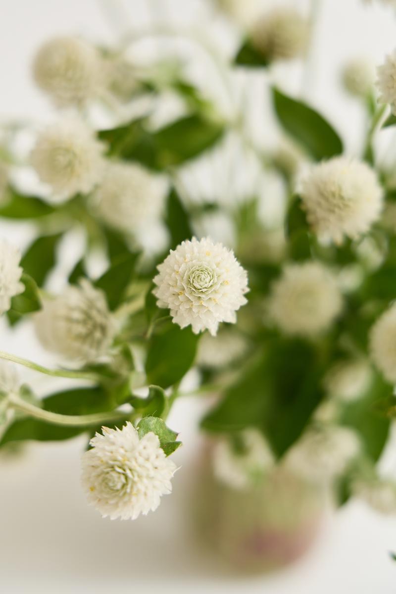 02 동글동글한 얼굴을 살리기 위해서는 섬세한 컨디셔닝 작업이 꼭 필요해요! 컨디셔닝 없이 그대로 어레인지할 경우 꽃의 수명도 짧아질 뿐만 아니라 잎사귀가 천일홍의 색감을 가릴 수 있어 최대한 제거해 연출해주시는 것이 좋습니다.