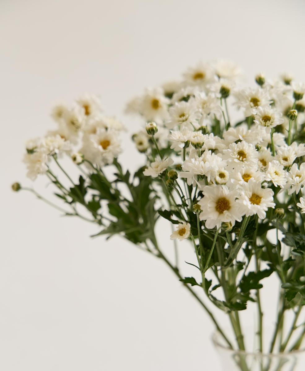 계란 소국은 이름으로 알 수 있듯이 마치 계란 후라이를 풀잎 위에 뿌려놓은 것 같아요. 작은 꽃송이들이 계란 노른자처럼 앙증맞아 보는 즐거움이 있습니다. 여러 송이가 모여 풍성하게 피어나 가볍게만 꽂아도 풍성해 보이는 장점이 있어요.