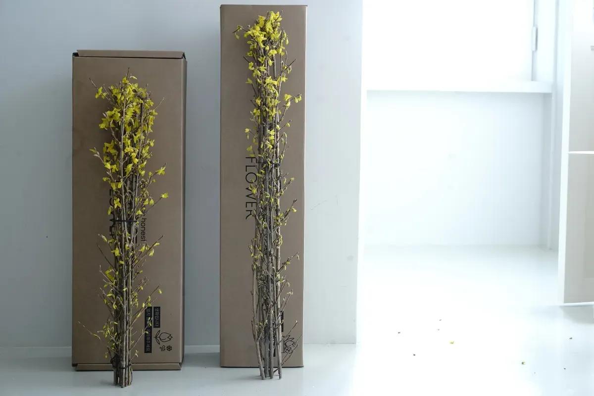 나뭇가지를 잘라서 보내지는 만큼, 수형이 일정하지 않으며 최대한 많은 꽃망울들을 경험할 수 있도록 길게 보내드리고 싶은 마음에 절지류를 담아 보내는 전용 박스에 담았습니다.