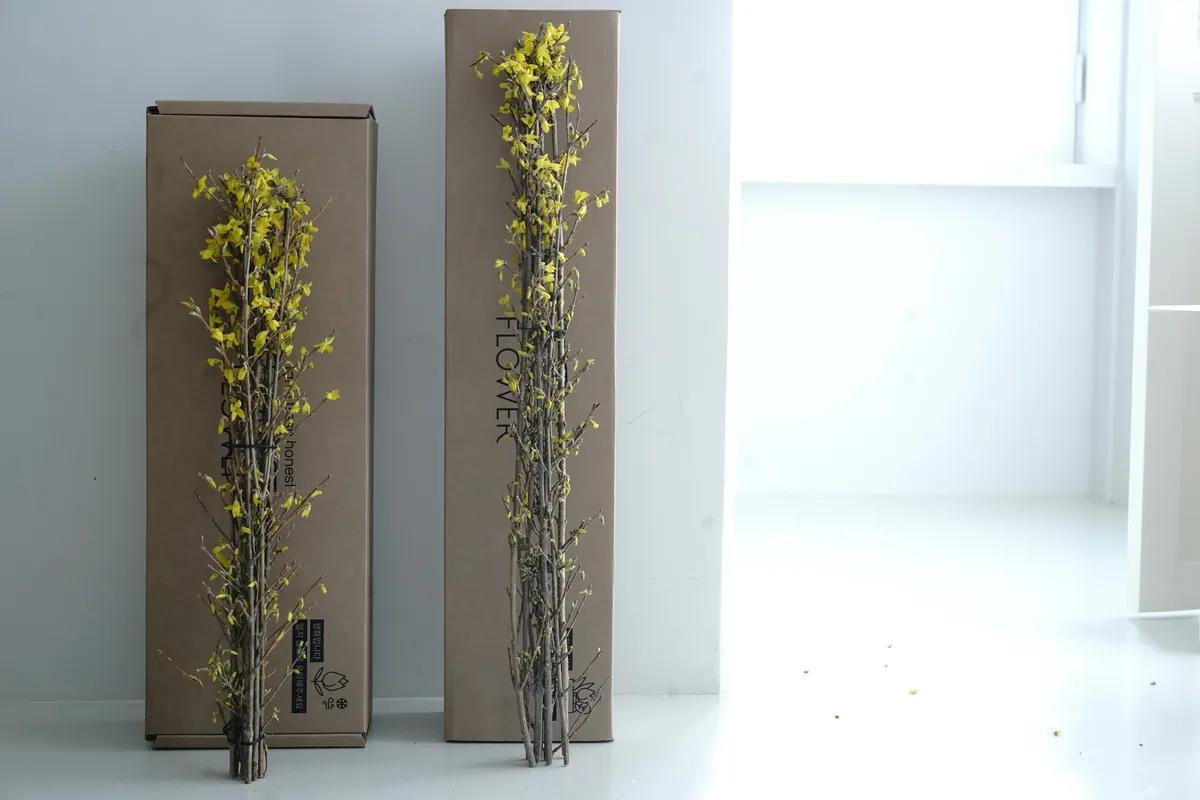 나뭇가지를 잘라서 보내지는 만큼, 수형이 일정하지 않으며 최대한 많은 꽃망울들을 경험할 수 있도록 길게 보내드리고 싶은 마음에 절지류를 담아 보내는 전용 박스에 담았습니다.