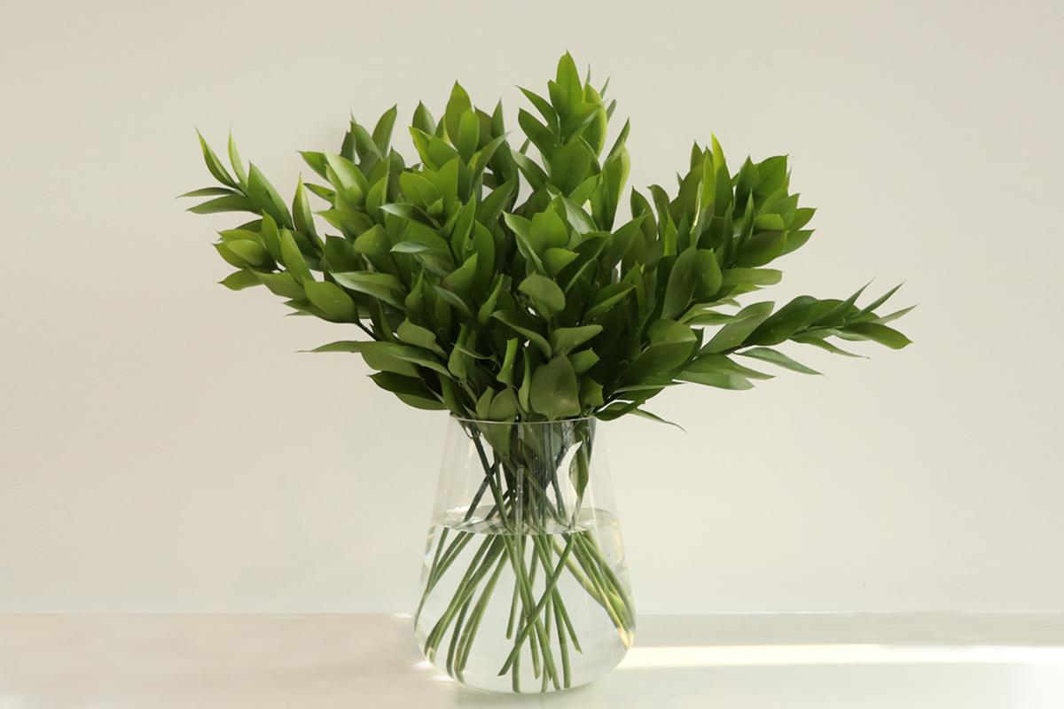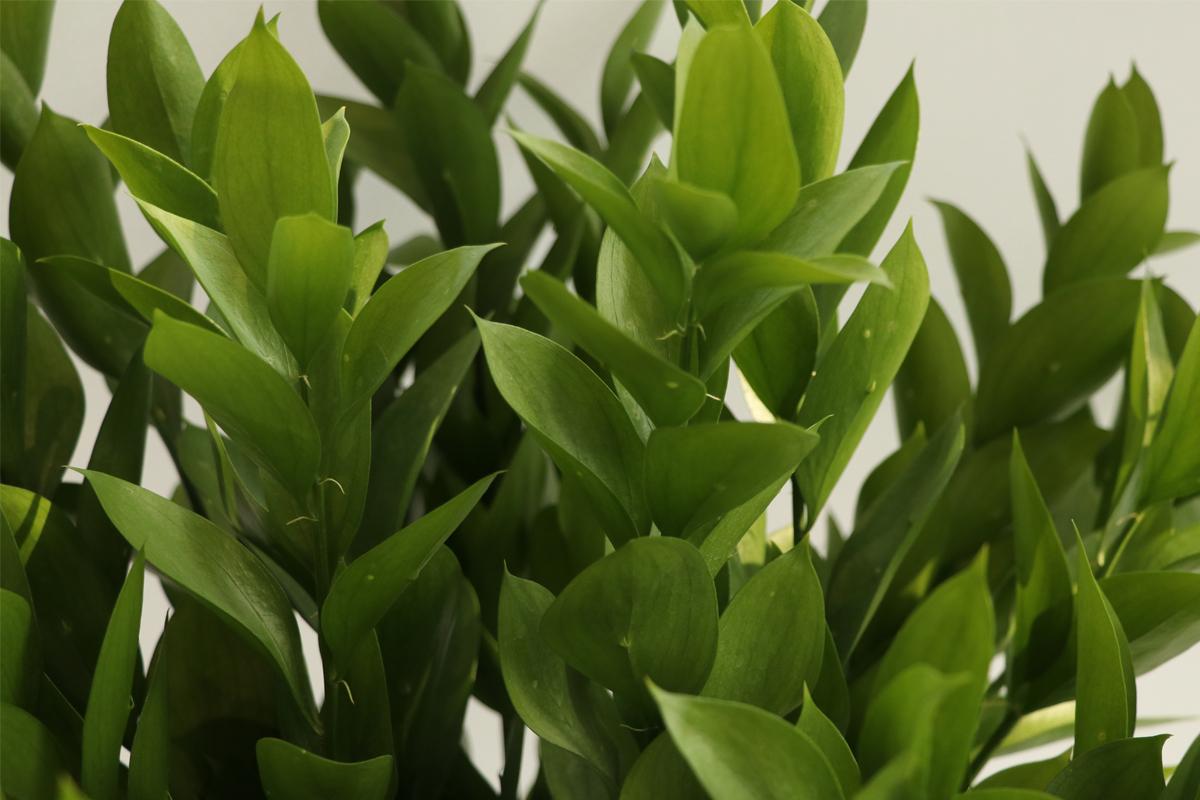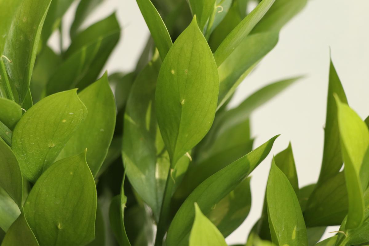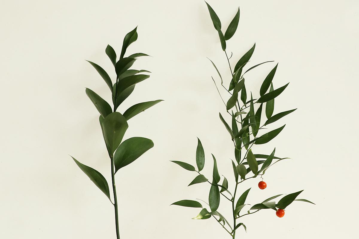 루스커스의 새순은 밝고 반짝이는 녹색, 시간이 지나면 진한 녹색으로 변합니다. 성숙한 잎은 물올림이 쉽고 오래 시들지 않아 약 2주전도 관상할 수 있어요.