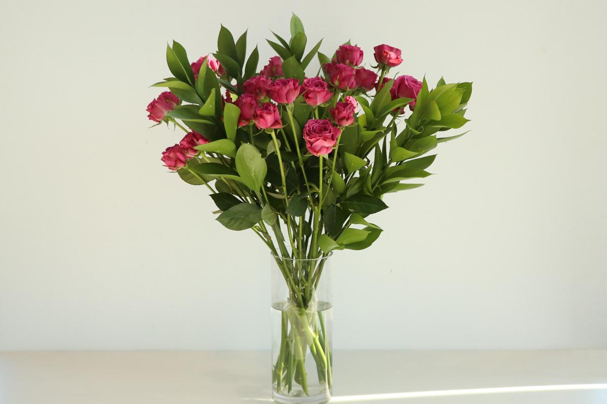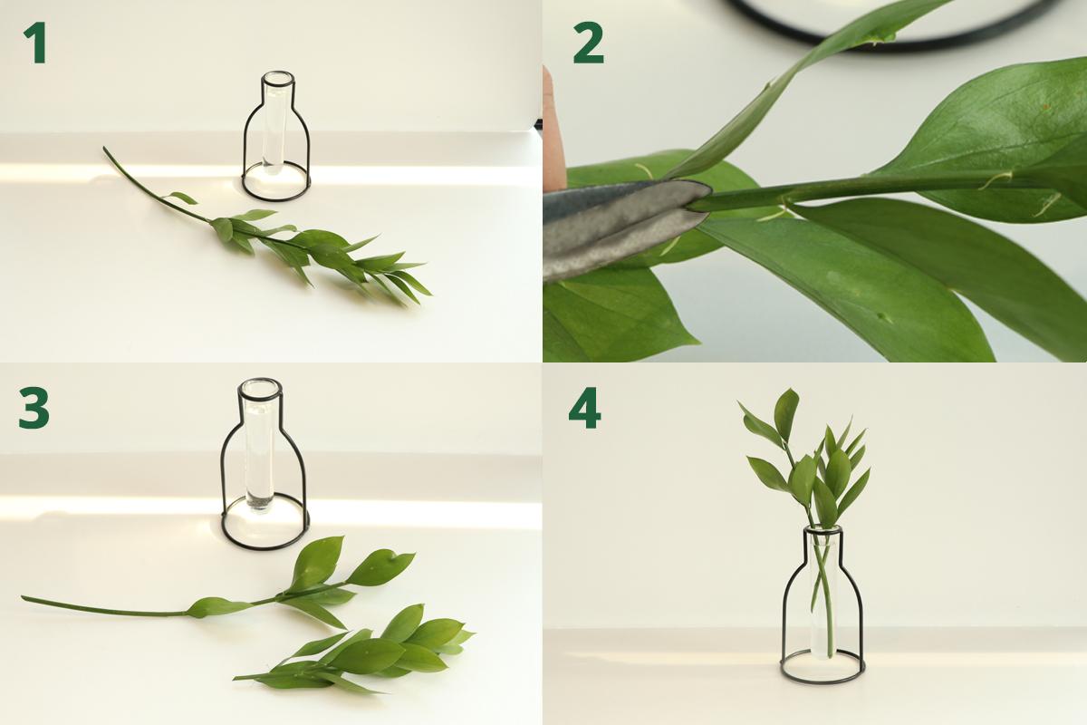 화병에 넣어 관상할 때는 물에 잠기는 위치를 확인 한 후, 그 아래의 잎들을 정리합니다. 잎을 정리할 때는 가위를 사용해도 좋고 손으로 간단히 떼어내 손질할 수도 있습니다. 이어서 줄기 단면을 사선으로 잘라 준 뒤 화병에 꽂아줍니다.