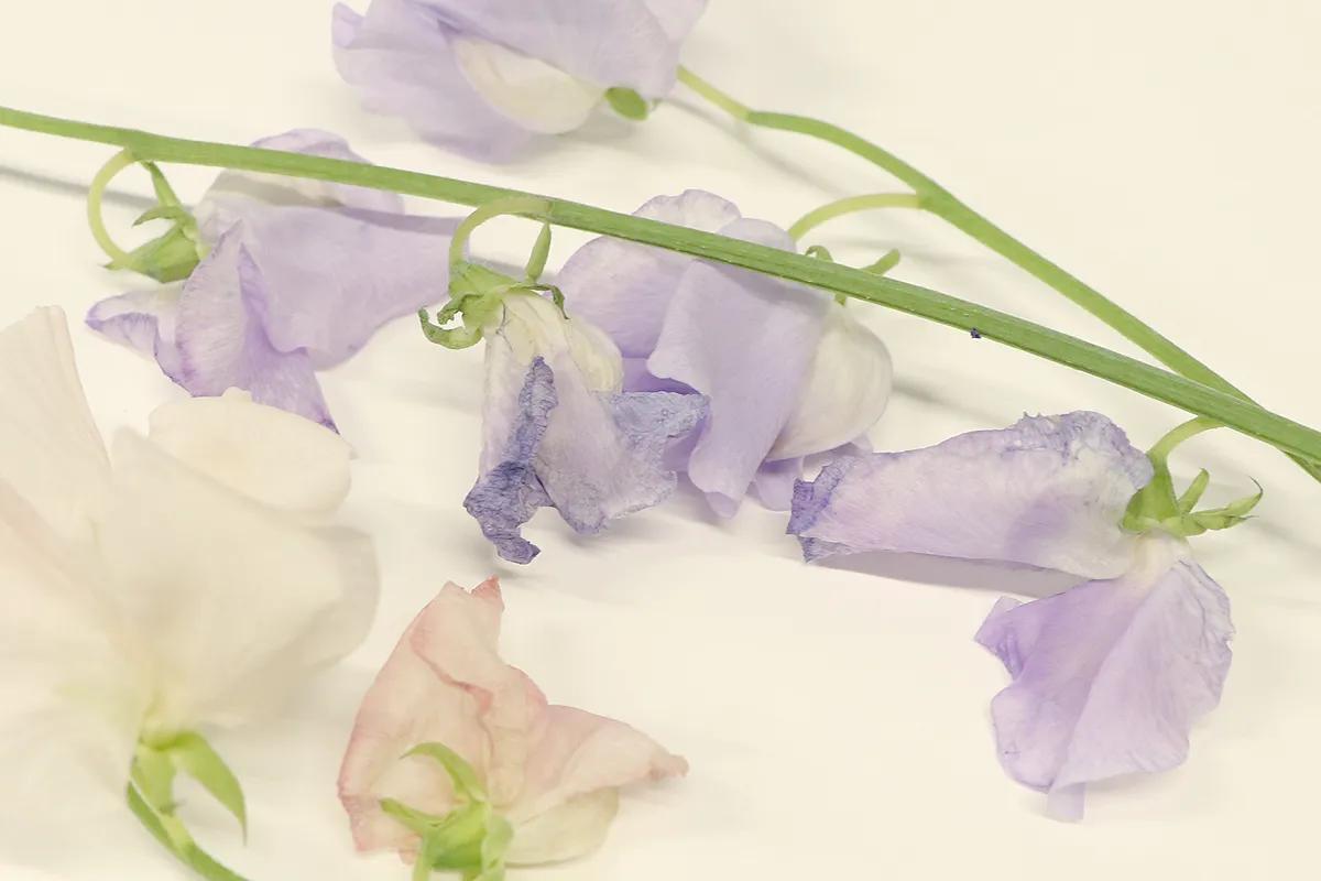 01 스위트피는 아래에서부터 꽃잎이 말라가며 시들어갑니다. 시든 꽃잎은 제거하여 위쪽에 달린 꽃망울을 감상한다면 더 오래 감상할 수 있어요.