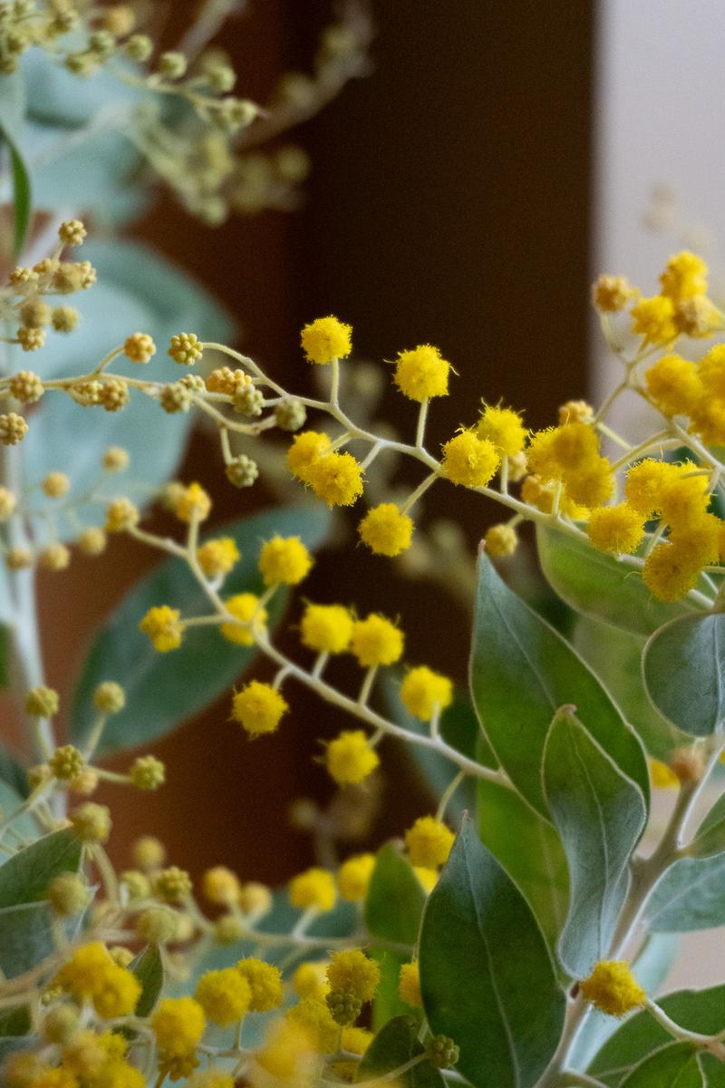 드라이된 미모사는 보송보송한 부피감이 다소 사라지고 색이 짙어진 상태로 그대로 말라붙습니다. 마른 뒤에도 은은한 향기와 색감이 유지되기에 드라이 플라워, 드라이 리스로도 많은 사랑을 받고 있습니다.