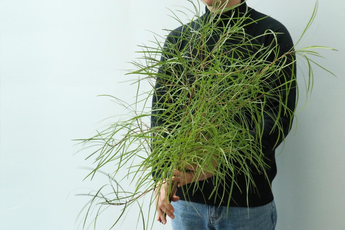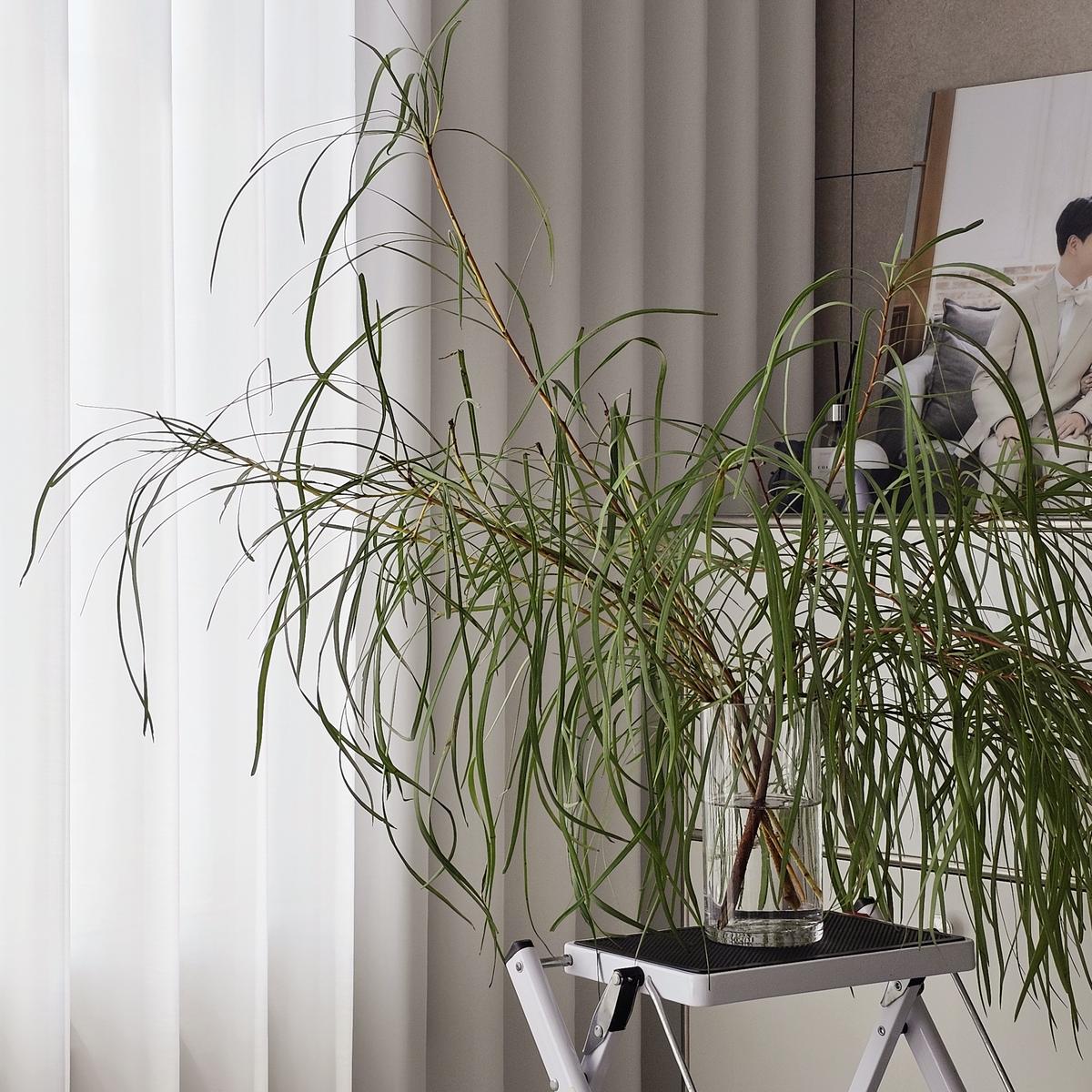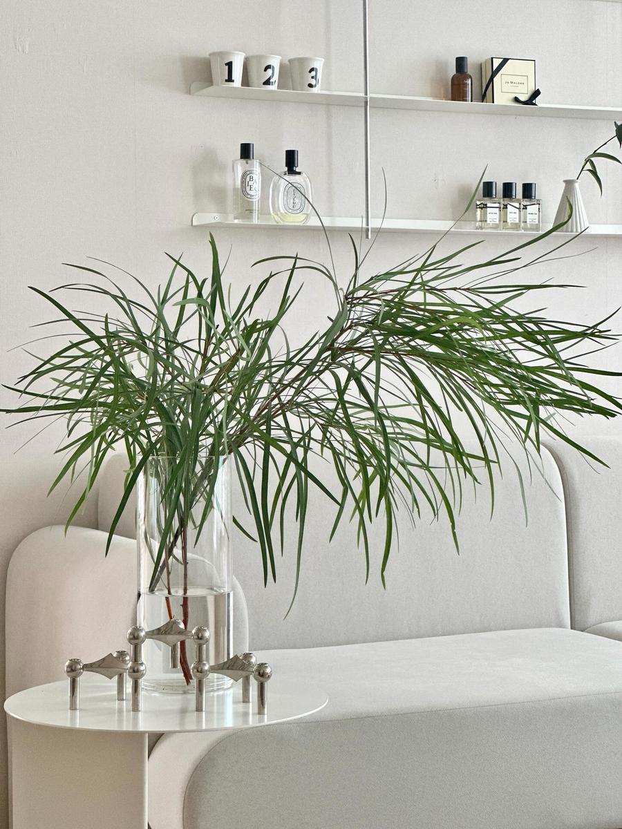 바커부쉬는 반단의 볼륨으로도 존재감이 충분해요. 화병에 툭! 꽂아두고 살살 만져주면 손쉽게 연출이 가능하답니다. 유리화병에 연출하면 깔끔한 무드를, 도자 화기에 연출하면 단아한 수양버드나무 같은 느낌으로 연출할 수 있어요.